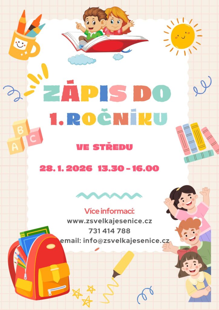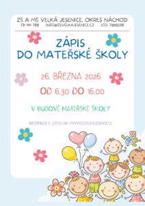 Zápis do 1. ročníku ZŠ se koná ve středu 28. ledna 2026 od 13.30 do 16.00 v budově ZŠ.