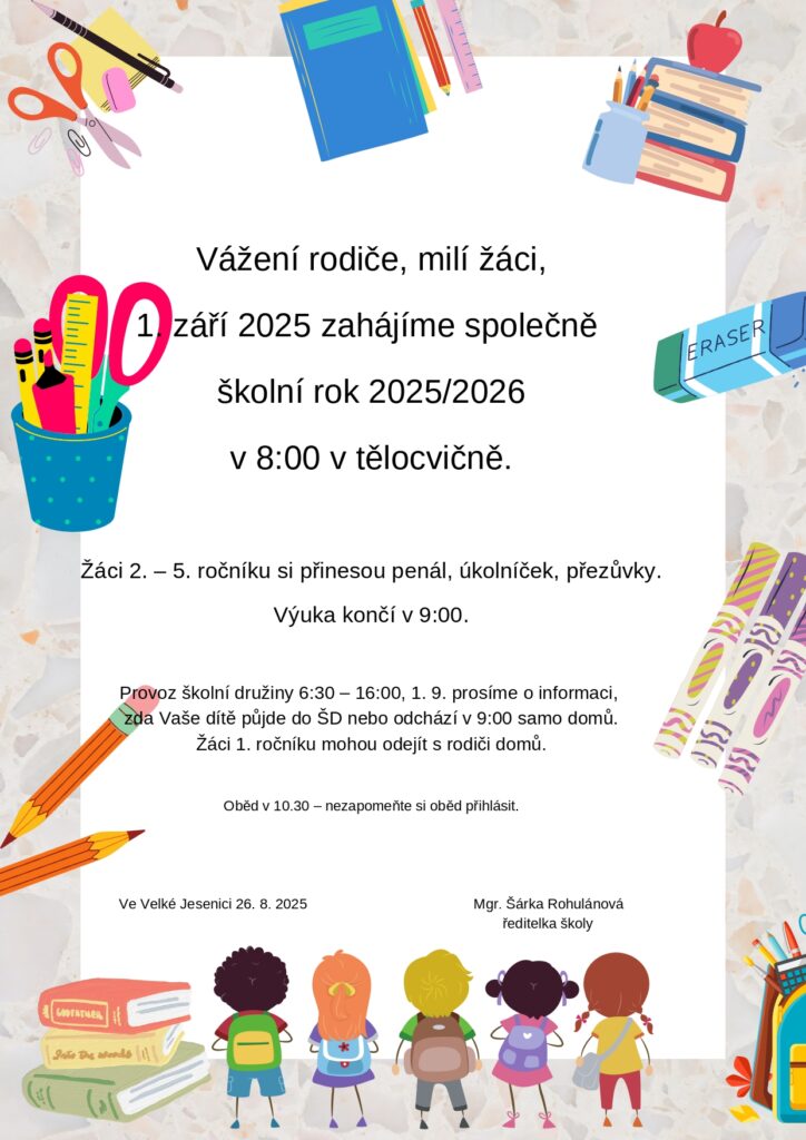 V pondělí 1. září zahájíme společně nový školní rok v 8.00 v tělocvičně.